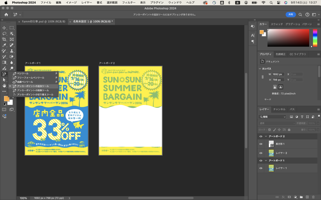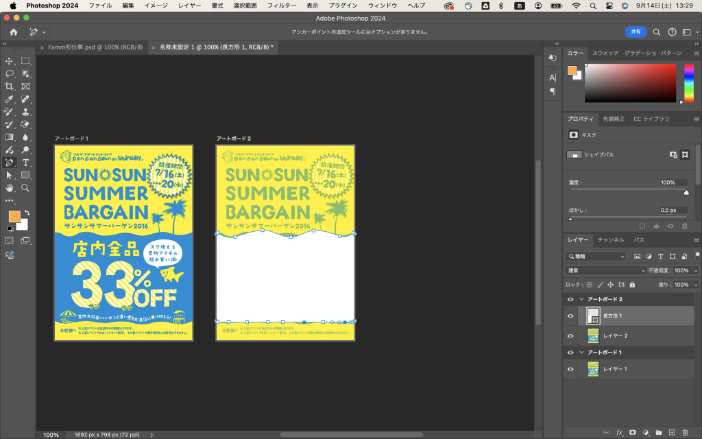 まず長方形を作ります。その後「アンカーポイントの追加ツール(ペンツールの中?にあるよ)」をクリックして、波の頭と底の部分にアンカーポイントを打ちます。