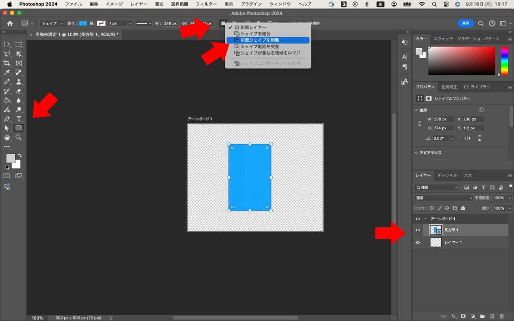 消したいレイヤーを選択している状態で、シェイプツールの中の「三角形ツール」をクリックし、上の□を選択し、「前面シェイプを削除」を押して、