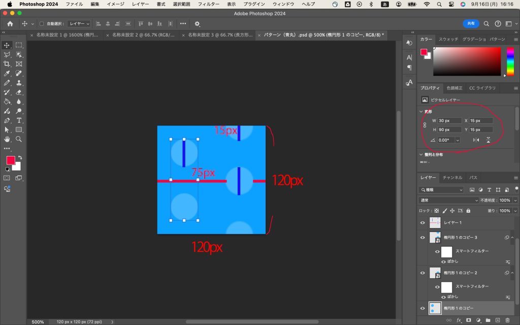 で、30pxの円を上のように配置。左側の円について、左端から15pxでしょ、円が30pxで、右側の円まで30pxあけて、右側の円が30pxで、右側の円の右端から余白が15px。ぜんぶで120px!おっけー!