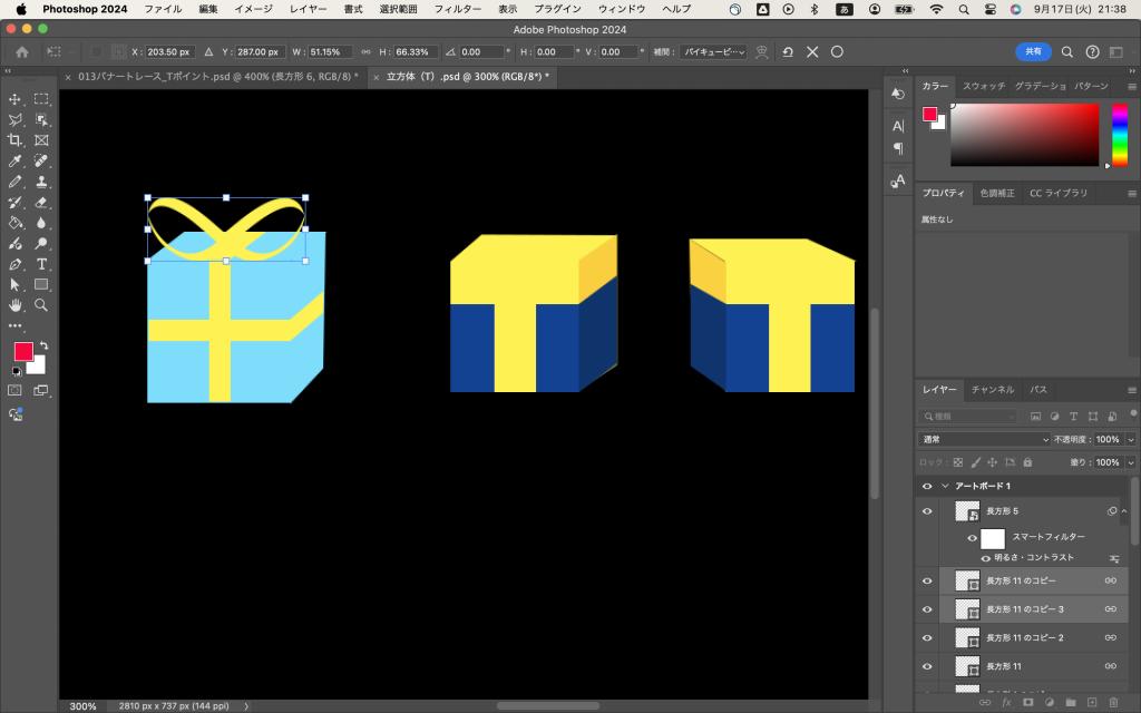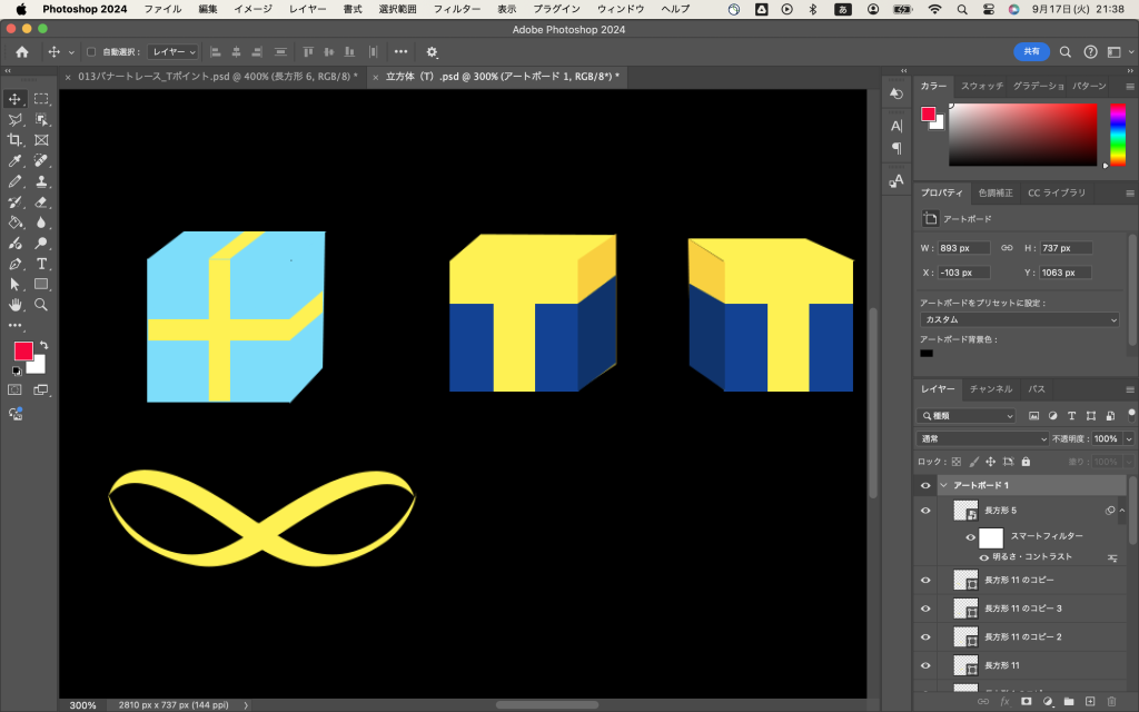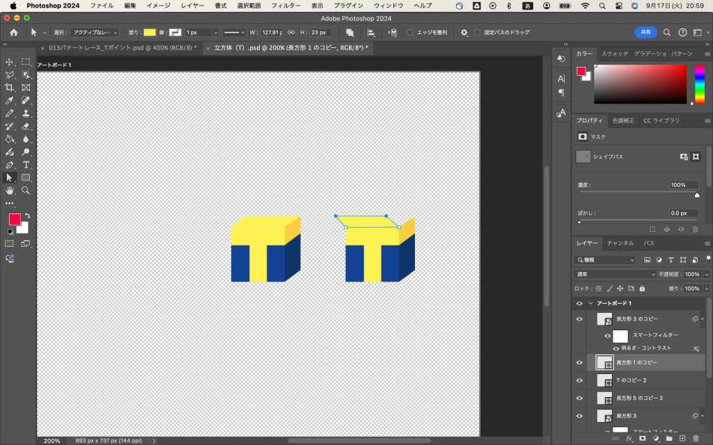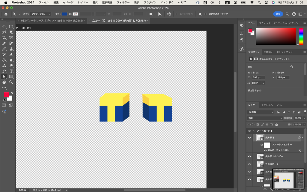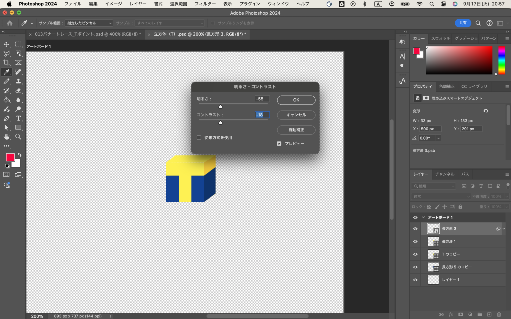 隣に長方形を作って、黄色と青に色分けして、この部分だけスマートオブジェクトにし、明るさとコントラストを変更して、無事にTポイントマークの立方体ができました。