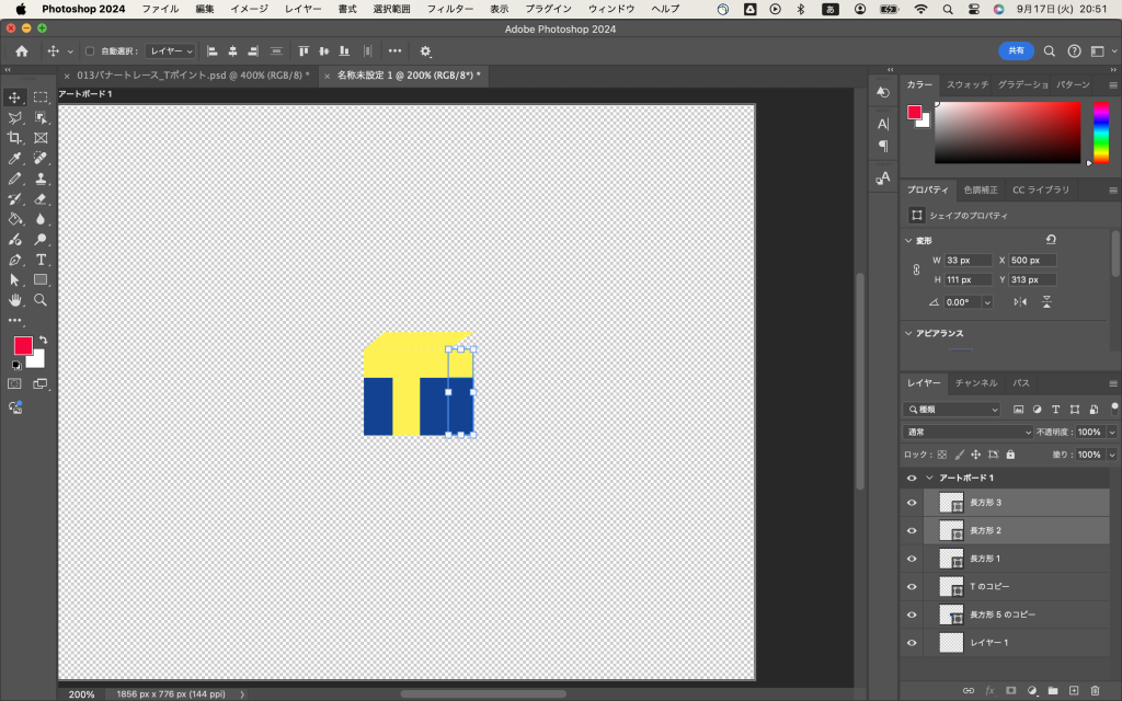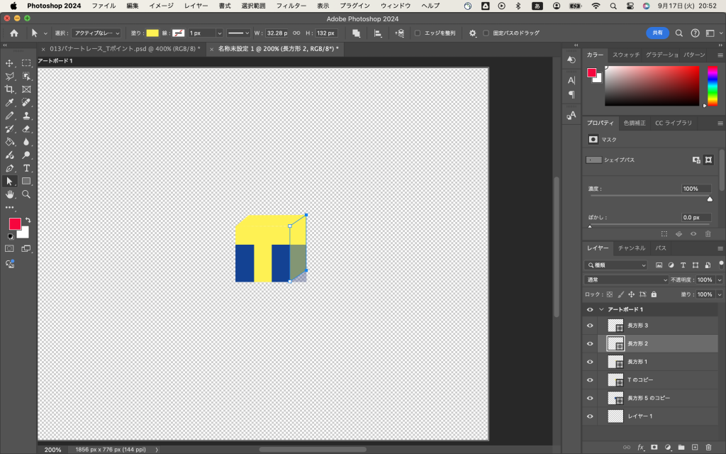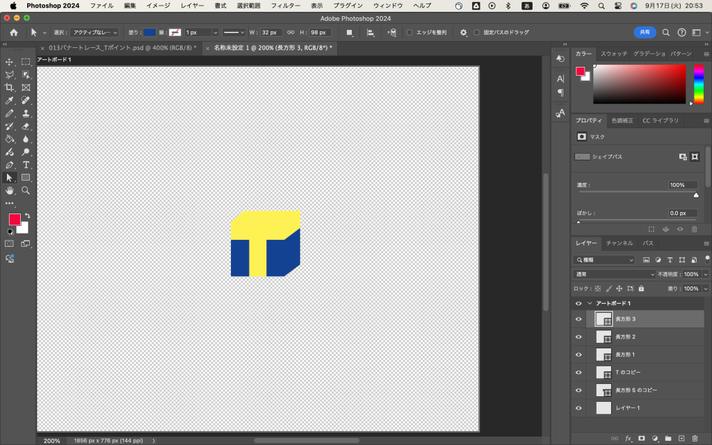 昨日作ったTの画像に細い横長の長方形(黄)を載せて、パス選択ツールで平行四辺形にし、