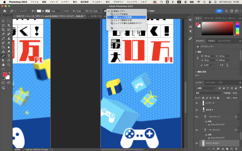 まずは、前面シェイプを削除という機能を使ってみることにしました。学んだ時に詳しく書いたので読んでほしい。