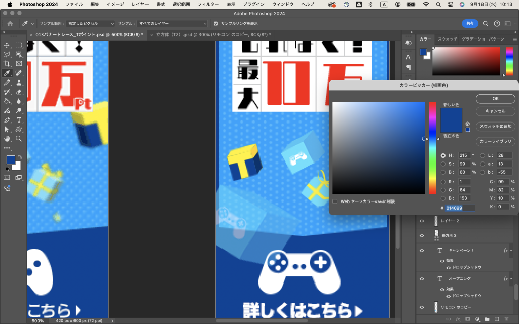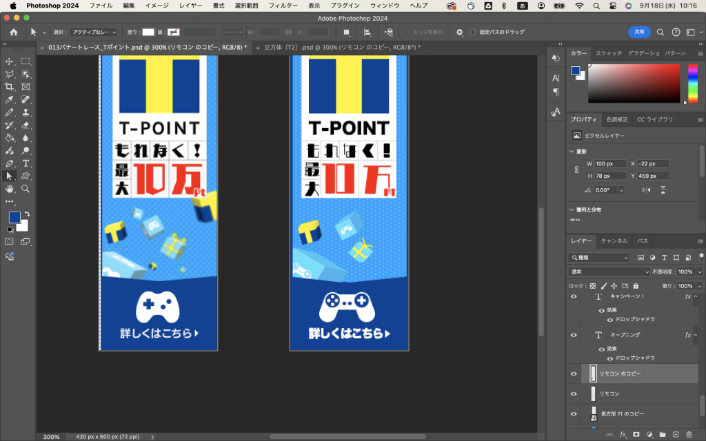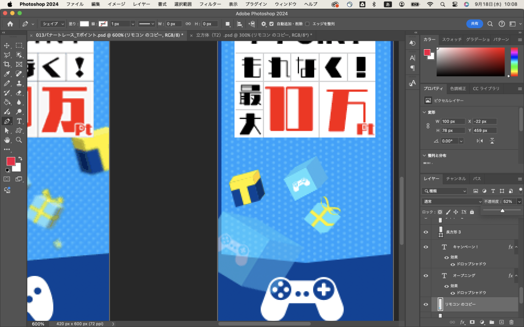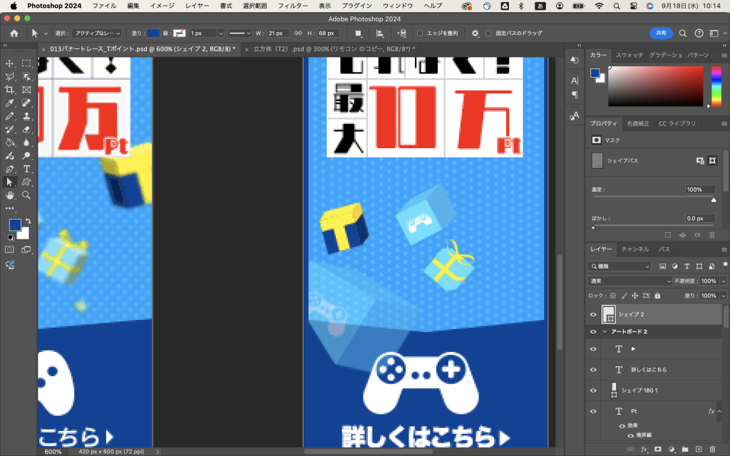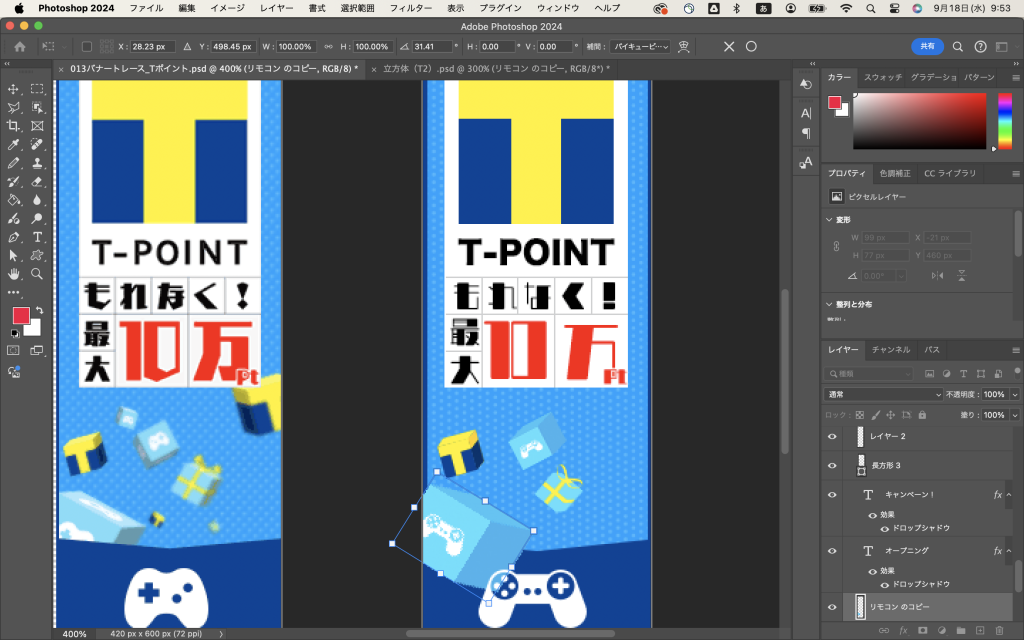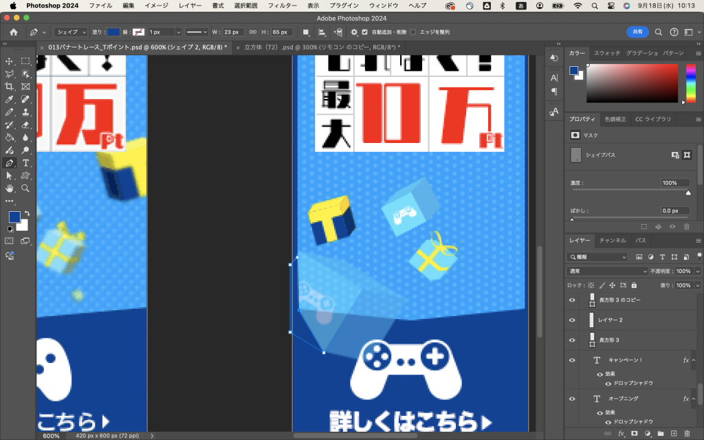 でね、出来上がった立方体を「レイヤーの結合」で一つのオブジェクトにしてから、バナーのファイルに持ってきて(クリックしたままカーソルをバナーのファイルのタブのところまで持ってくるだけ)、バナーの上で離して、シフトキーを押しながら適宜サイズを調整してみるとですね、