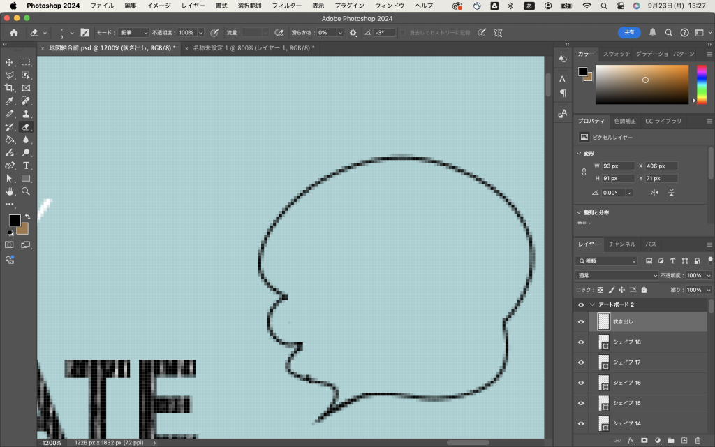 で、曲線ペンツールからペンツールに持ち替えて、この滑らかな線に沿ってぽちぽちぽちっと、線を打っていきます。途中で線が滑らかに途切れていて、これ、コツコツ作ってもいいんですけど、最後に背景色と同じ色で線を描くことにしました。