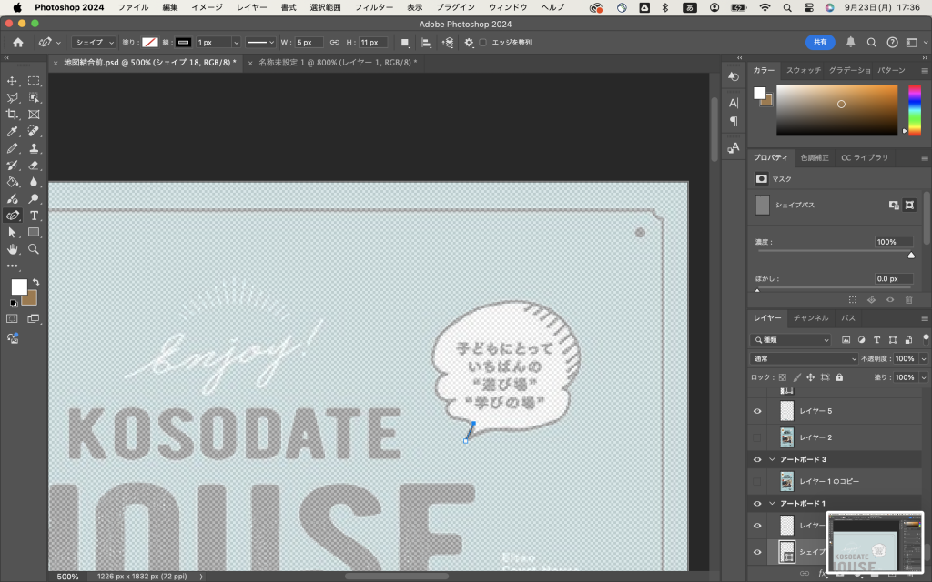 地図がですね…。多分これ、もっと大きいサイズで作って、最後に縮小するべきだったんだと思うんですよね。初めから完成サイズと同じサイズで作ってしまったので、文字がつぶれてしまいました。(文字は黒にして、白の縁取りをつけています。縁取りは最小サイズが1pxだったので、黒の部分がほとんどなくなってしまいました…)