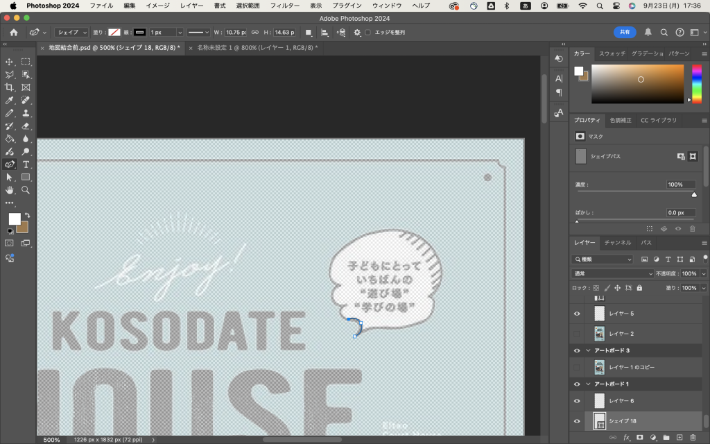 これは曲線ペンツールで描画タイプを「シェイプ」にして色をつけて作っています。この線は後から消すので、色はなんでもいいと思います。