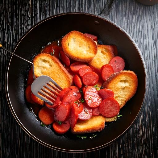 プロンプト:フライパンで薄切りにしたソーセージを炒めているところ