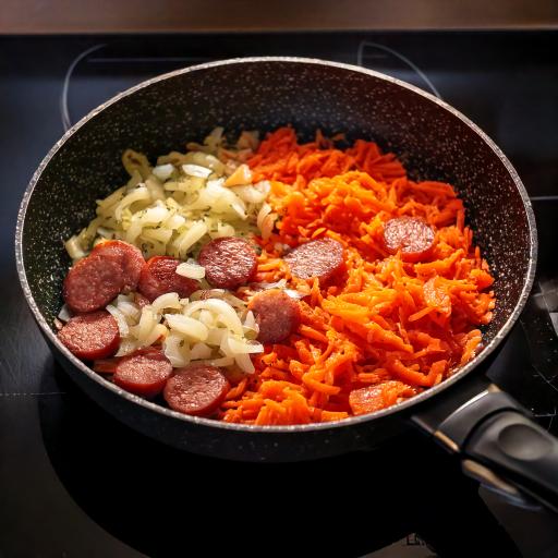 次はみじん切りにした玉ねぎ・人参と、薄切りにしたソーセージをフライパンで炒めている写真がほしい。