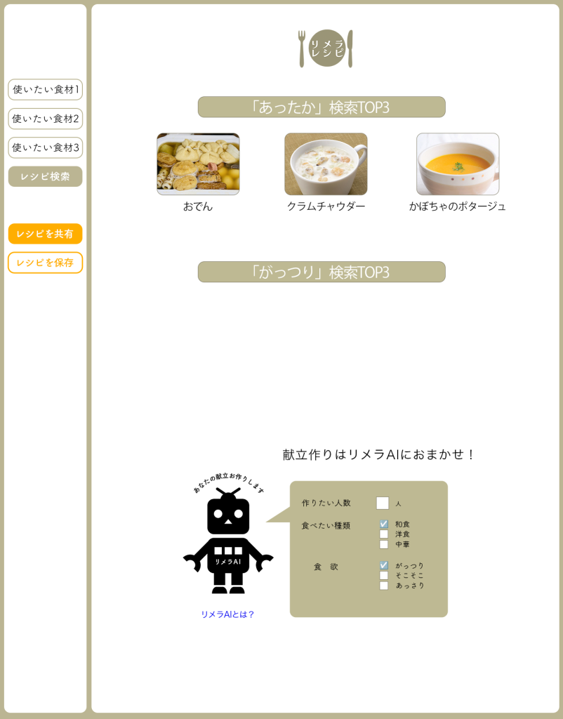 もうとにかくレシピを探す、献立を作る、というストレスを極限まで減らしたいという目的がありますので、TOPページはその日の気温に合わせてランダムで、この日の天候に合わせて最も検索されている単語で出てくるメニューを全面に押し出すことにしました。