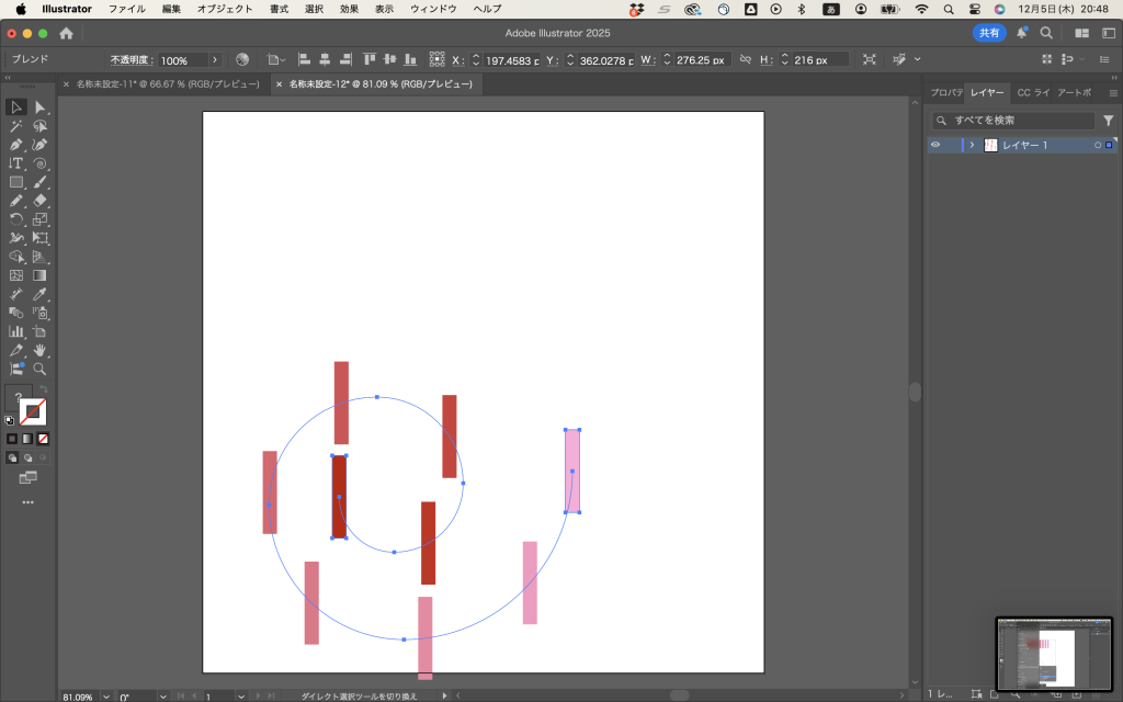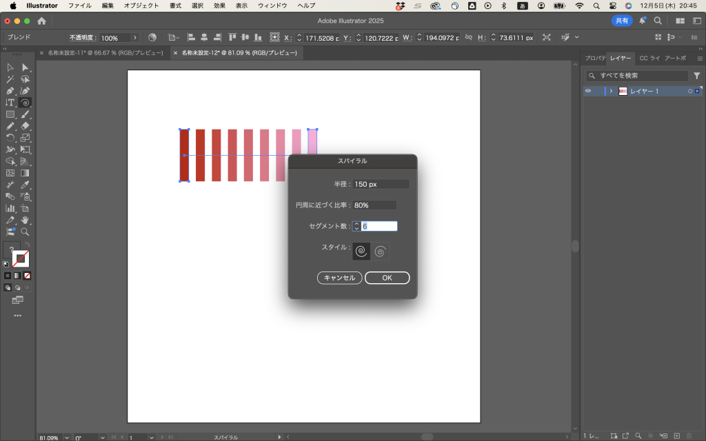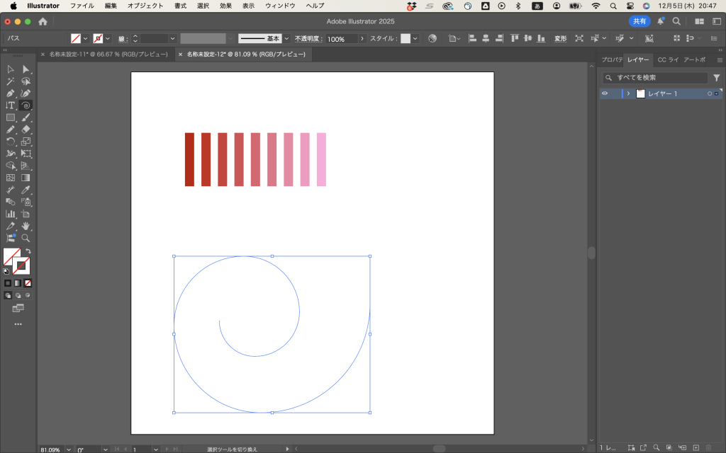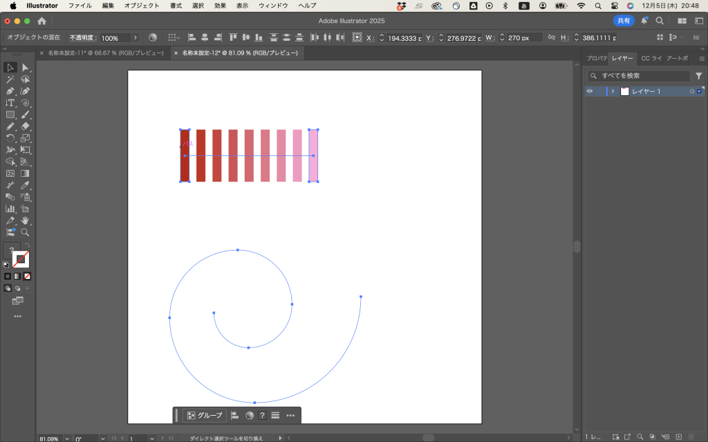 螺旋と、さっき作った色がちょっとずつ違う長方形を選択して、
